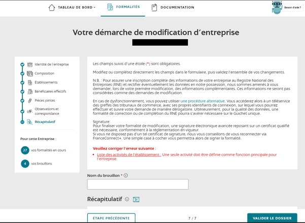 3ème bug INPI : Liste des activités de l’établissement : Une seule activité doit être définie comme fonction principale pour l’entreprise.