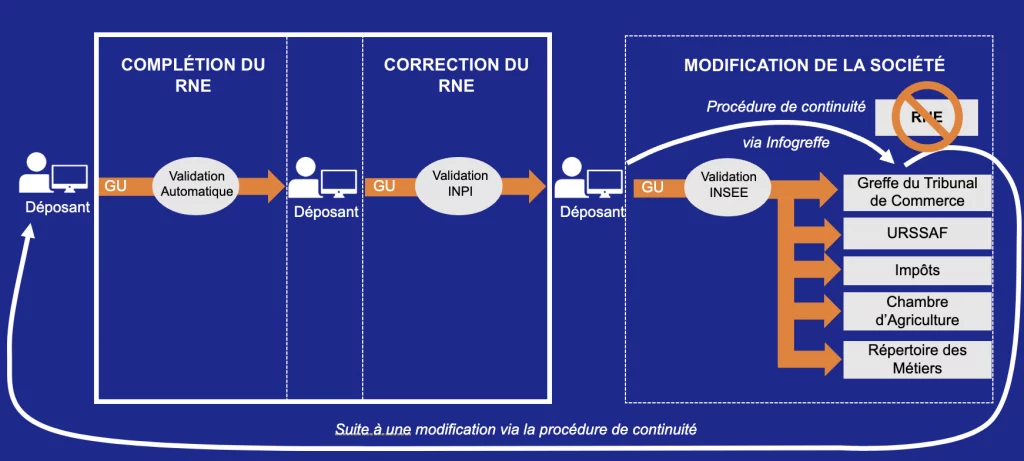 Toutefois, si vous choisissez Infogreffe ou l’URSSAF pour votre formalité, il est important de noter qu’ils ne sont pas tenus de transmettre la mise à jour des données au RNE. La procédure de continuité ne permettant pas une mise à jour automatique, il vous faudra impérativement procéder à une formalité de complétion/correction du RNE sur le Guichet Unique.