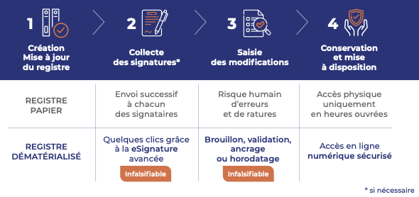 Ces réglementations, complétées par celle, plus globale du décret n° 2019-118 du 31 octobre 2019, qui permet de dématérialiser l’ensemble des registres légaux d’une société, viennent fonder la légitimité d’une digitalisation des registres légaux, dont celui des actionnaires. Aujourd’hui, les registres dématérialisés ont la même valeur juridique que ceux tenus physiquement.