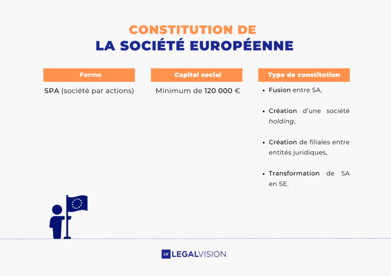 Une SE doit revêtir la forme d’une société par actions (= SPA) avec un capital social minimum de 120 000 €. De plus, sa création ne peut se faire ab initio. Les sociétés composées d’au minimum deux États membres différents et qui souhaitent constituer une SE disposent de plusieurs options :