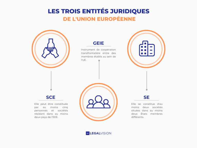 Les entités juridiques détiennent des droits leur permettant d’exercer leurs activités dans des établissements. L’Union Européenne en dénombre trois : la Société Européenne (SE), la Société Coopérative Européenne (SCE) et le Groupement Européen d’Intérêt Économique (GEIE). Elles cohabitent avec les entités nationales, représentant parfois pour elles un véritable appui.