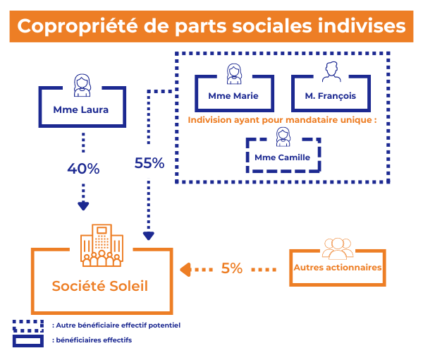 Madame Marie et Monsieur François détiennent ensemble 55 % du capital de la Société Soleil en indivision, ce qui les qualifie chacun comme bénéficiaires effectifs.