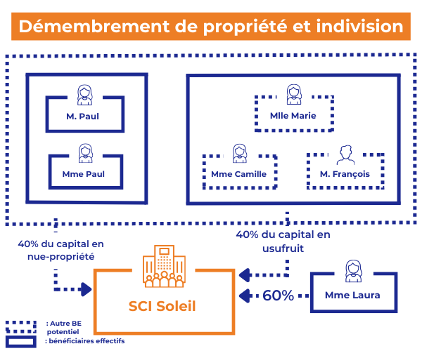Monsieur et Madame Paul sont les bénéficiaires effectifs de la SCI Soleil, tout comme, d’après les statuts, Madame Camille, Madame Marie, Monsieur François et Madame Laura.