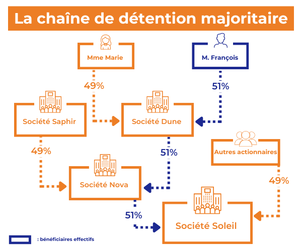 Monsieur François est bénéficiaire effectif de la société Soleil. Bien qu’il ne possède que 13,26 % du capital de cette société de manière indirecte (51 x 51 % x 51 % = 13,26 %), il détient la majorité des actions dans la société Dune.