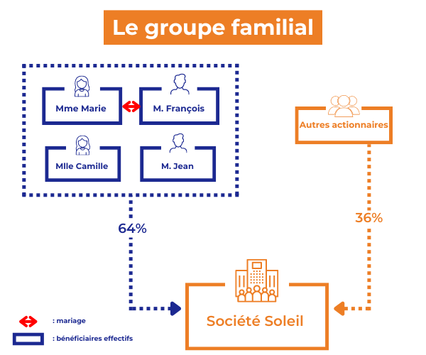Madame Marie et Monsieur François, ainsi que leurs deux enfants, Jean et Camille, sont considérés comme bénéficiaires effectifs de la Société Soleil en tant que membres d’un « groupe familial ».