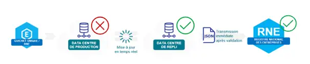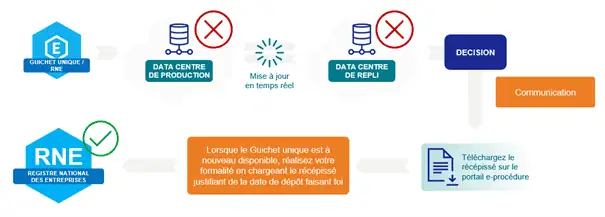 - Le data centre de production est KO → Un data centre de repli est activé sous 12 heures pour permettre le dépôt des formalités.