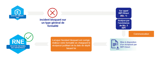 - Blocage généralisé sur un type de formalité → sur appel à INPI Direct (niveau 1) puis si besoin, analyse par l’assistance de niveau 2 de l’INPI. Le récépissé est aussi nécessaire dans ce cas de blocage.