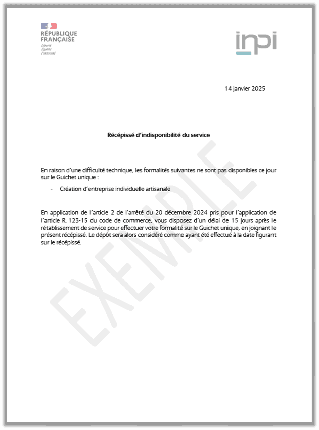 Vous disposez alors d’un délai de 15 jours après le rétablissement du service pour réaliser votre formalité en justifiant de la date avec le récépissé délivré. Celle-ci sera alors prise en compte comme si elle avait été effectuée à la date figurant sur le récépissé.