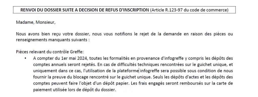 Cependant, la procédure de continuité a bien été mise en place en cas de difficultés rencontrées sur le Guichet Unique. Sans la preuve de celles-ci, le Greffe peut refuser le dossier.