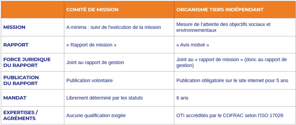 Un organisme tiers indépendant (l’« OTI ») sera chargé de vérifier, l’exécution des objectifs poursuivis par la société et la sincérité de sa mission. Il est désigné par l’organe de gestion de la société, sur proposition du comité de mission.