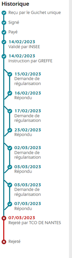 - Suivre régulièrement l’avancement du dossier. Si le statut reste bloqué trop longtemps à « En attente de validation », il est recommandé de signaler le problème à l’INPI, car le dossier est potentiellement en erreur et ne sera pas transmis au Greffe.