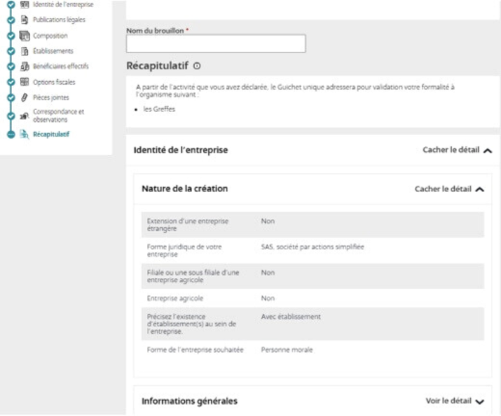 Une fois enregistrée, il n’est pas possible de modifier la synthèse, contrairement à ce qui était le cas auparavant pour les Greffiers. De plus, toutes les informations saisies via le Guichet Unique sont automatiquement transférées dans le Registre National des Entreprises (RNE).
