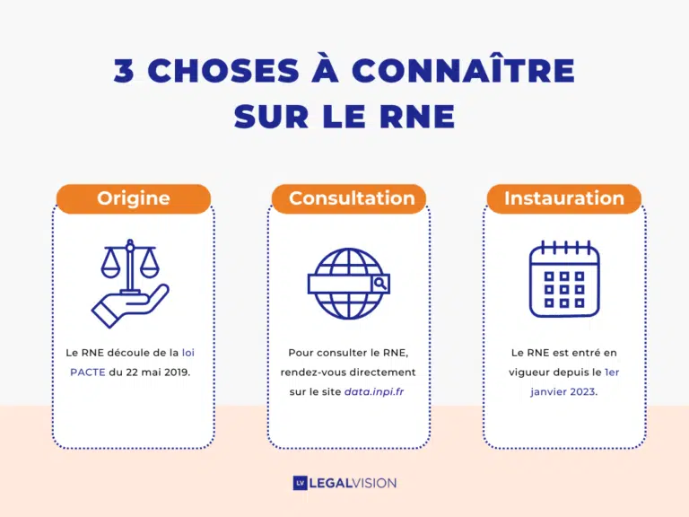 Le Registre national des entreprises (RNE) a été mis en place le 1er janvier 2023 par la loi PACTE. Il a notamment pour rôle de centraliser les informations relatives aux entreprises établies sur le territoire français.