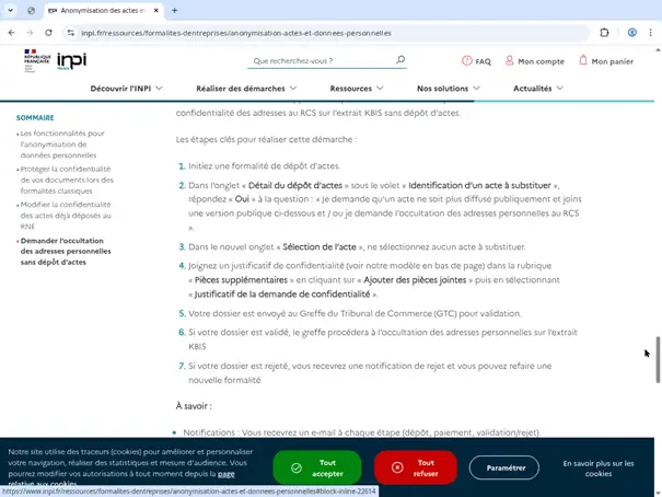 - Occultation sur le Kbis : la procédure vise à supprimer l’adresse personnelle des dirigeants sur l’extrait Kbis. La demande peut être faite en même temps qu’une formalité RCS (création, modification, dissolution) ou indépendamment.