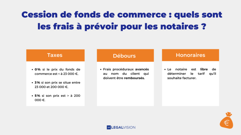 Les taxes, les débours et les honoraires constituent les frais de notaire relatifs à la vente d’un fonds de commerce.