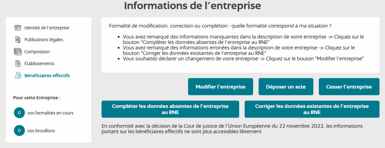 - Depuis juillet 2024, l’accès public au RBE a été restreint et les mises à jour doivent être effectuées exclusivement via le Guichet Unique de l’INPI.