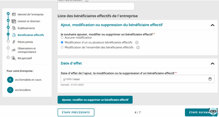 - Une entreprise souhaitant modifier ses bénéficiaires effectifs doit se rendre sur le Guichet Unique, remplir le formulaire de déclaration et fournir les documents justificatifs nécessaires.
