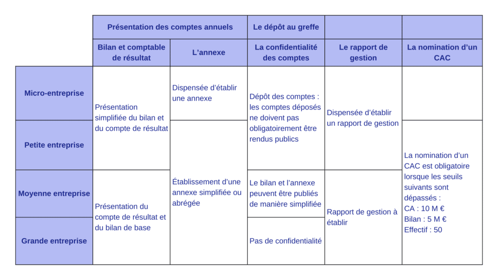Examinons les obligations comptables imposées aux entreprises en fonction de leur qualification.